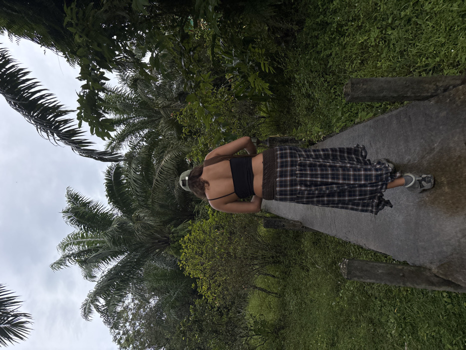 An adult female is depicted from behind, walking forward on a wet, light grey concrete pathway in Khlong Sok, Thailand. She is wearing a light olive-green baseball cap reversed, a black spaghetti-strap crop top exposing her midriff, a wide brown textured waist wrap, a long dark plaid skirt, and grey athletic shoes. A brown strap is visible over her right shoulder. The concrete path is bordered by short, square concrete posts and is surrounded by dense, verdant tropical vegetation, including numerous large palm trees with extensive fronds, various green shrubs, and low-lying plants. The sky above is overcast.