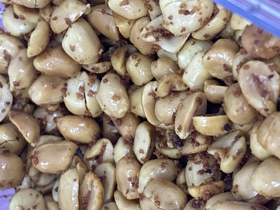 A close-up shows a dense pile of blanched peanuts, many halved, with a glossy sheen