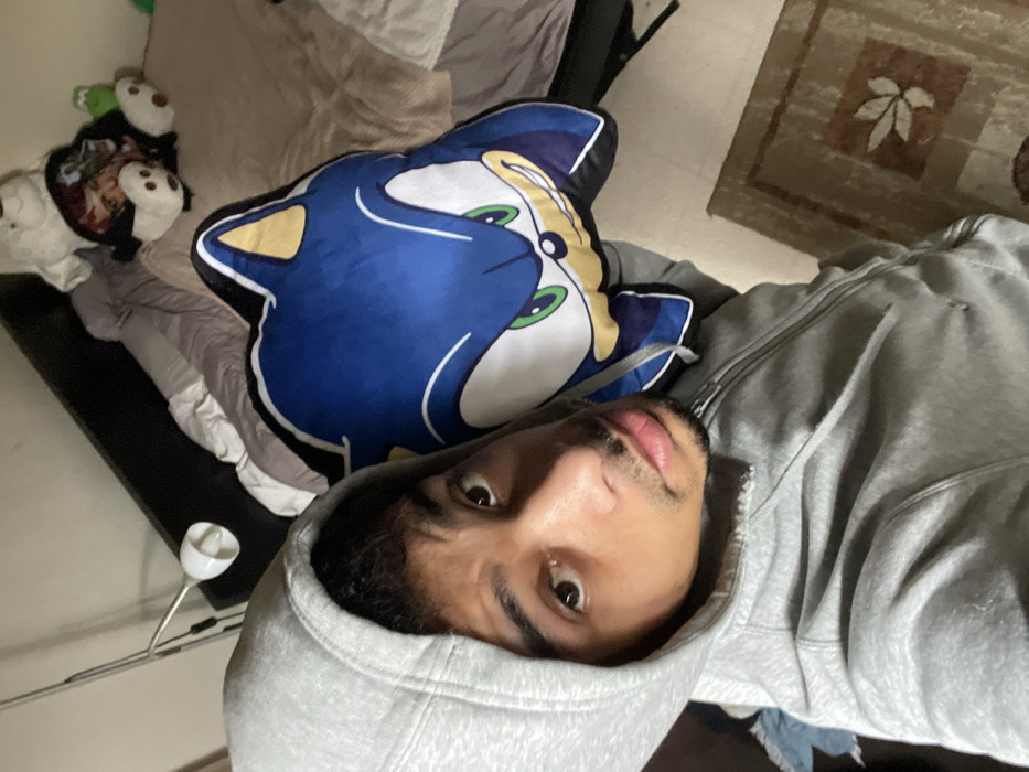The image displays a young man taking a selfie in what appears to be a bedroom located in Plaisir, France. The subject, a male with dark hair and stubble, is wearing a grey zippered hooded sweatshirt with the hood pulled over his head. He holds a large, blue Sonic the Hedgehog plush pillow against his left side, featuring Sonic's head with white eyes, green irises, and a peach-colored muzzle. Behind him, to the upper left, an adjustable silver-colored lamp with a white cone-shaped light fixture is visible. To the upper right, an unmade bed with a dark headboard is present, covered with grey and beige bedding. On the bed, near the headboard, a large white teddy bear wearing a dark garment is positioned next to a smaller green stuffed animal. The lower right portion of the image shows a section of a patterned rug with a light brown and beige leaf design.
