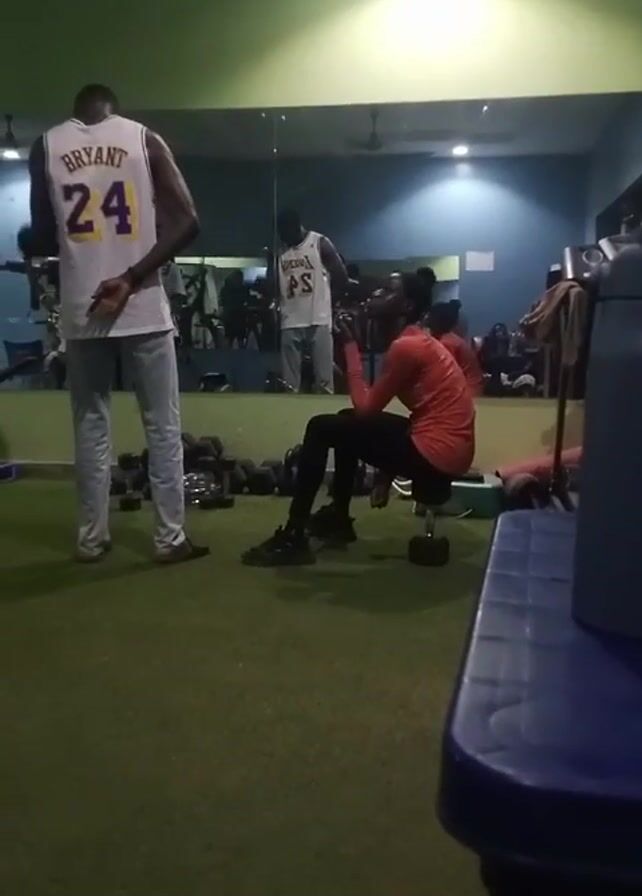 gym scene. A person wearing a white basketball jersey with the number 24 and "Bryant" on the back is standing with his back to the camera. Another person is sitting on a weight bench and gets up to walk to the left side of the frame. The gym has a mirror along the back wall, showing other people working out in the background. Dumbbells are scattered on the green floor. A blue water container and bench are on the right side of the frame. The gym is lit with overhead fluorescent lights. There is music playing.