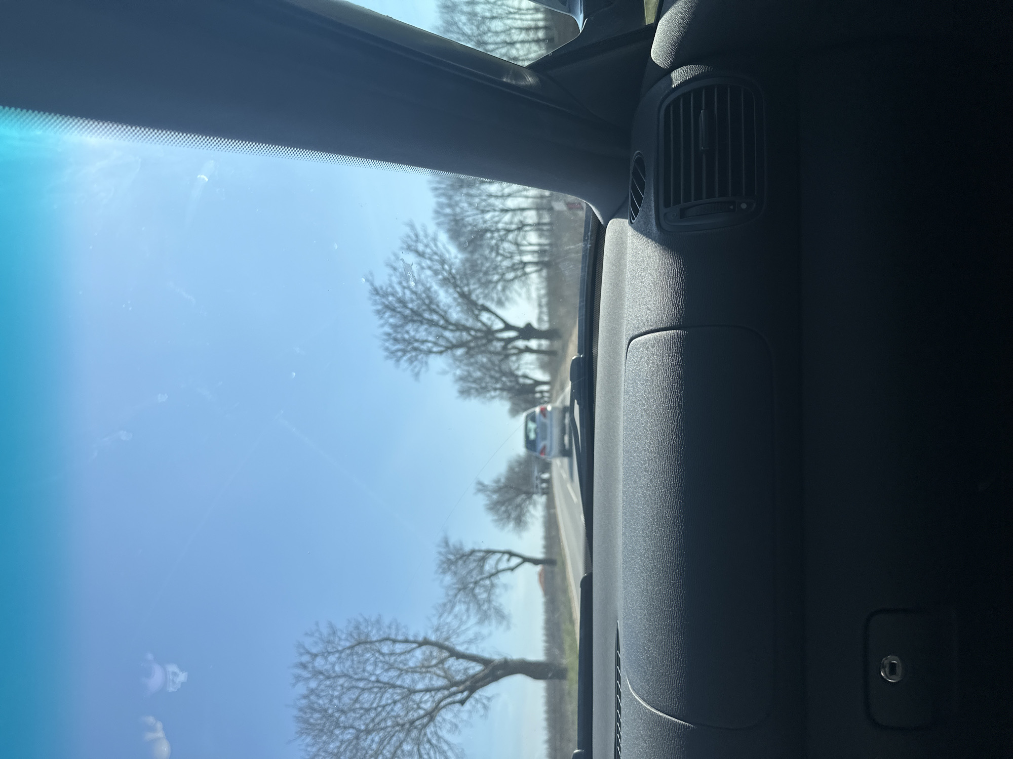 The image depicts a clear, bright daytime scene on a rural road in Branishte, Bulgaria, viewed from inside a moving vehicle. The foreground shows the dark, textured dashboard of the vehicle, including a glove compartment lock on the left and an air vent on the right. The vehicle's A-pillar is visible on the far right. Ahead, through the windshield, a two-lane asphalt road extends into the distance, with a silver sedan traveling ahead, centered in the lane. Both sides of the road are lined with leafless deciduous trees, indicative of late winter or early spring. Beyond the trees on the left, agricultural fields are visible, with the faint outline of a reddish-brown roof in the far distance. The sky above is a clear, brilliant blue, with noticeable glare and reflections on the windshield from the sun, which is positioned high and slightly to the right. No individuals are visible.