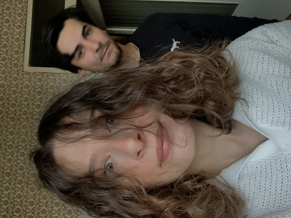 This indoor image, captured in Yerevan, Armenia, features two individuals. In the foreground, a female with medium-brown curly hair partially obscures her face; her wide-open brown eyes and closed lips are visible. She wears a white, textured, collared top. Positioned behind and to the right, a male with dark hair and stubble is slightly blurred, looking towards the camera. He wears a dark long-sleeved shirt with a white dog silhouette logo visible on the left chest area. The background consists of patterned wallpaper featuring a repeating muted floral or damask design in brown and beige tones, and a light-colored doorframe behind the male. The overall lighting suggests an indoor setting.