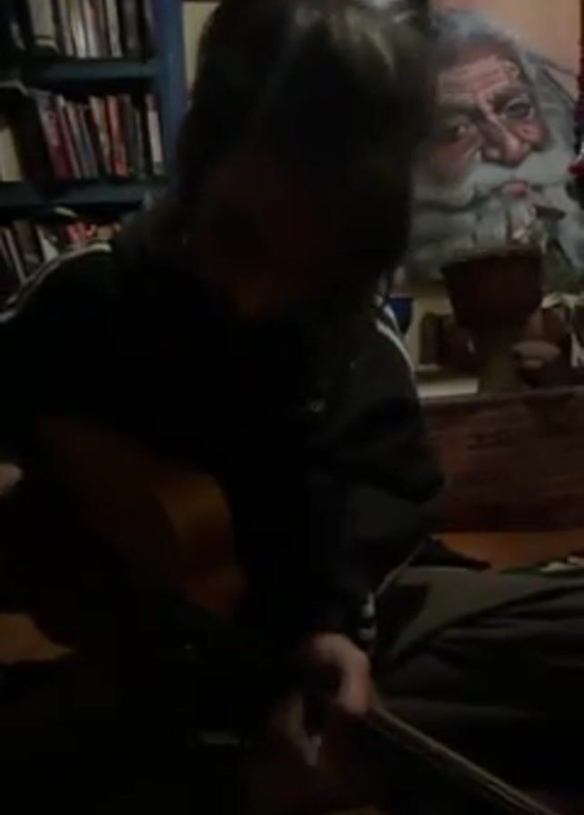 A person with dark hair pulled up in a bun and a goatee is sitting cross-legged on the floor, playing a ukulele. The person is wearing a dark hoodie with white stripes on the sleeves. Behind the person is a bookcase filled with books, a painting of a person with a white beard, and other decorative items. The room is dimly lit.
