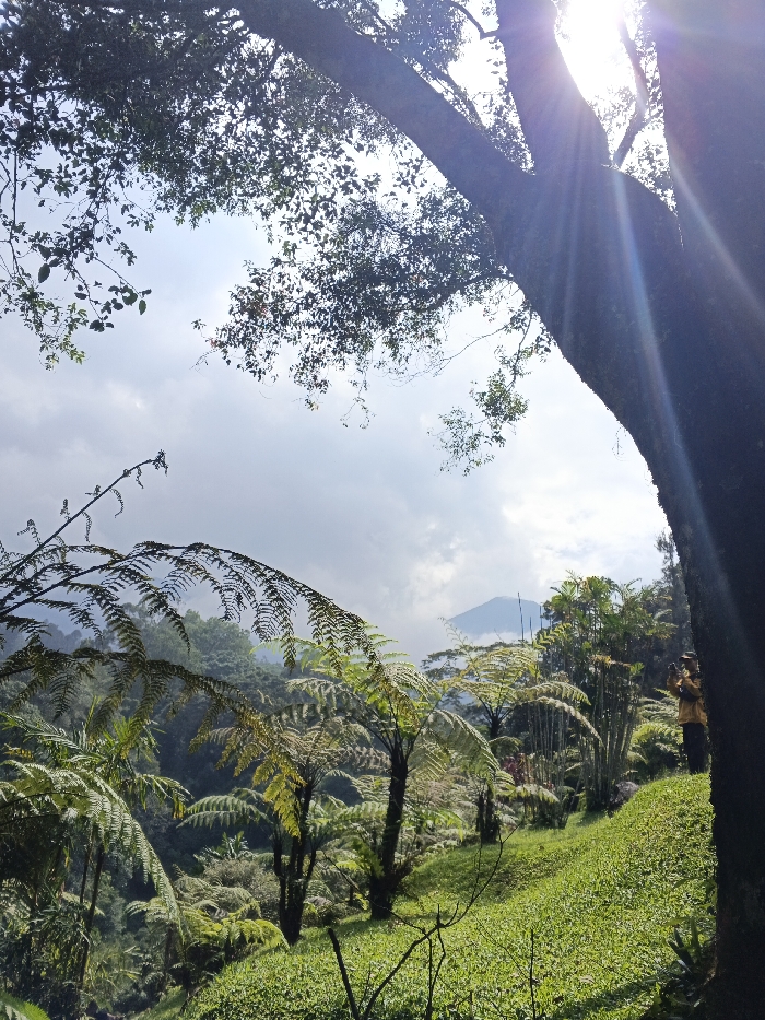 Lush green foliage blankets a hillside, featuring distinctive tree ferns with feathery fronds. A tall tree dominates the right edge, its branches reaching towards a cloudy sky and obscuring the sun, creating lens flares. Distant mountains peek through the mist. A person stands on the hillside, partially hidden behind the tree, appearing to take a photograph. The scene evokes a sense of tranquility and natural beauty.