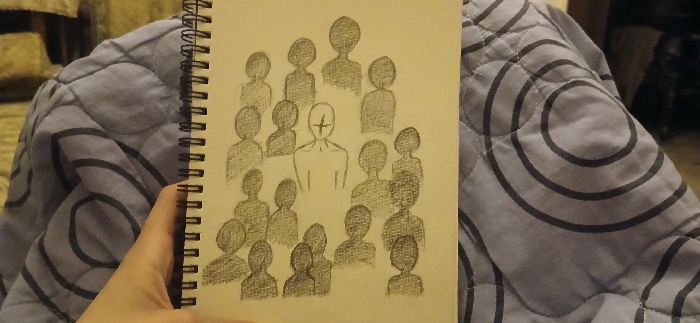 An overhead photograph depicts a light-skinned human hand holding an open, spiral-bound notebook against a quilted fabric surface. The notebook's page displays a pencil drawing of approximately fifteen stylized human figures. Most figures are rendered as shaded, faceless silhouettes with rounded heads and shoulders, arranged in multiple rows. A single central figure, positioned slightly above the center of the page, is larger and depicted in outline only, with a prominent cross symbol marking its face. The surrounding quilted fabric is light grey with a repeating pattern of concentric dark grey circles. The background beyond the fabric is out of focus and dark. The scene is located within Al-Midan Municipality, Syria.