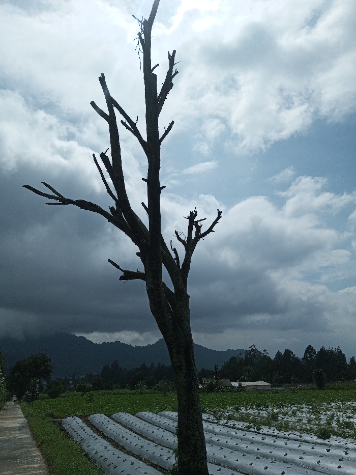 A stark, leafless tree dominates the scene, its silhouette contrasted against a dynamic sky of dark storm clouds and patches of bright blue. Below, rows of covered crops stretch across a field. Mountains are visible in the distance, adding depth to the landscape. The image evokes a sense of starkness and transition, with the dormant tree standing against the backdrop of cultivated land and impending weather. A narrow path borders the field on the left.