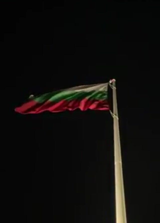 The video depicts a flag waving atop a tall pole against a dark, possibly night, sky. The flag has three horizontal stripes of equal width, with green on top, white in the middle, and red on the bottom. The pole is light-colored and cylindrical, potentially made of metal. It appears illuminated from a light source that isn't directly visible. The flag waves slightly in the wind.
