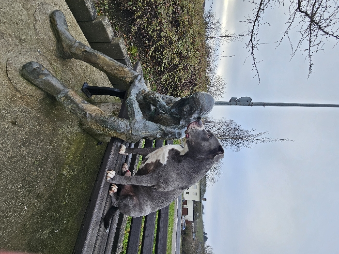 In Bech-Kleinmacher, Luxembourg, a weathered, bronze-colored statue of a seated human figure with its head bowed is positioned on the left side of a dark wooden slatted bench. The statue exhibits green verdigris or moss. To its right, a grey American Bully type dog with a white chest and white paws is seated on the same bench, actively licking the head region of the statue. Behind the bench, dense green and brown shrubbery forms a midground, partially obscuring a tall, grey lamppost located between the statue and the dog. In the background, under an overcast grey sky, light-colored buildings with dark roofs are visible, followed by gently sloping hills or vineyards. The immediate foreground consists of a concrete or paved surface exhibiting areas of moss or algae growth. Bare tree branches are visible against the sky on the far left.