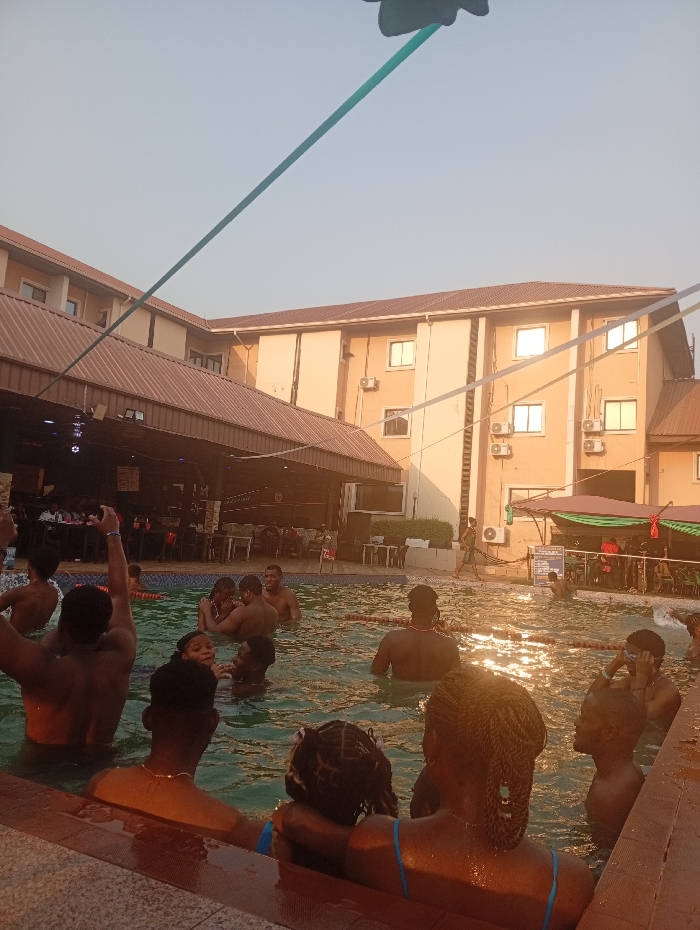 A pool party is in full swing at an outdoor pool adjacent to a hotel. Several people are enjoying the water, with some standing near the edge. A covered area with tables and chairs is visible in the background, suggesting a dining or gathering space. Decorations are strung across the scene, adding to the festive atmosphere. The sun's reflection sparkles on the water's surface.