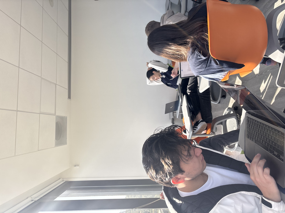 The image depicts an indoor scene within a modern room in Interlomas, Mexico, likely a classroom or study area, illuminated by bright natural light