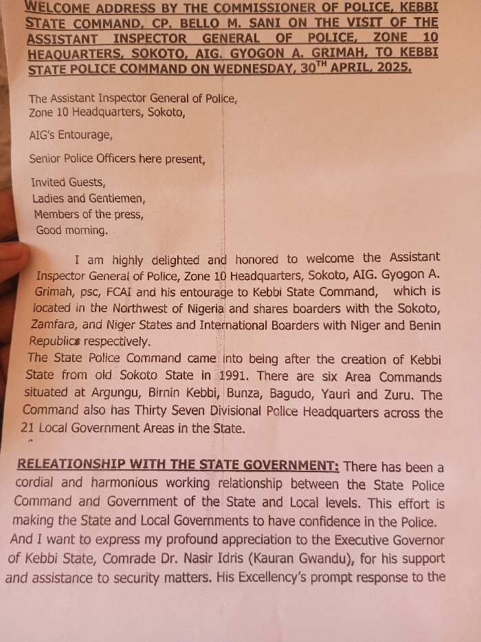 The image is a speech delivered by the Commissioner of Police, Kebbi State Command, CP. Bello M. Sani on the visit of the Assistant Inspector General of Police, Zone 10 Headquarters, Sokoto, AIG. Gyogon A. Grimah to Kebbi State Police Command on Wednesday, 30th April, 2025. The speech is addressed to the Assistant Inspector General of Police, Zone 10 Headquarters, Sokoto, AIG. Gyogon A. Grimah, psc, FCAI and his entourage to Kebbi State Command, which is located in the Northwest of Nigeria and shares boarders with the Sokoto, Zamfara, and Niger States and International Boarders with Niger and Benin Republics respectively. The State Police Command came into being after the creation of Kebbi State from old Sokoto State in 1991. There are six Area Commands situated at Argungu, Birnin Kebbi, Bunza, Bagudo, Yauri and Zuru. The Command also has Thirty Seven Divisional Police Headquarters across the 21 Local Government Areas in the State. The speech then discusses the relationship with the state government, noting that there has been a cordial and harmonious working relationship between the State Police Command and Government of the State and Local levels. This effort is making the State and Local Governments to have confidence in the Police. The Commissioner of Police expresses his profound appreciation to the Executive Governor of Kebbi State, Comrade Dr. Nasir Idris (Kauran Gwandu), for his support and assistance to security matters. The speech is delivered in the headquarters of the Kebbi State Police Command, which is located at the coordinates provided (latitude: 12.466, longitude: 4.252), which is in the city of Gwadan Gaji, Nigeria.