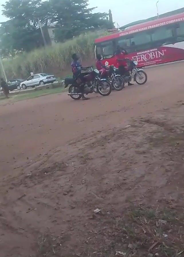 dusty, unpaved area with three men on motorcycles. They appear to be waiting, as the motorcycles are stationary. Behind them, there's a red and white bus with the words "ABUJA URBAN MASS TRANSPORT COMPANY LIMITED" visible. Several cars are parked nearby, and a few people are walking around. The sky is overcast, and there are trees and some buildings in the background. The video ends without any movement from the motorcycles or significant change in the scene.