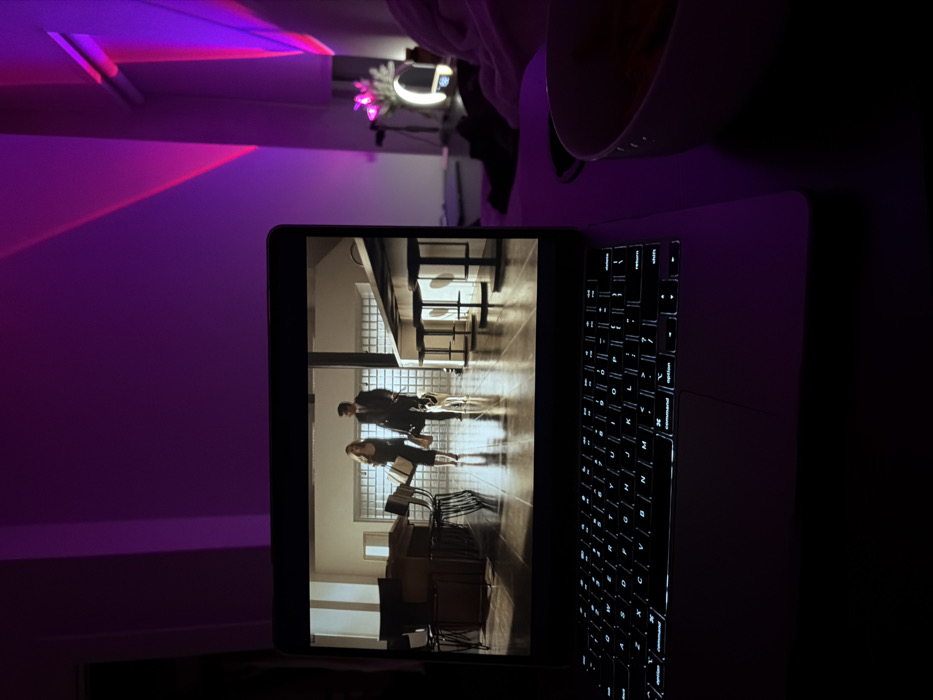 This scene is located in a dimly lit room in Austin, United States of America. The primary subject is an open, silver-colored laptop, likely a MacBook, positioned on a dark surface. Its backlit keyboard is illuminated. The laptop's screen displays a cinematic scene featuring two individuals and a dog walking through a well-lit, modern interior. A woman, on the left, carries multiple shopping bags. A man, on the right, wears a dark coat and walks a small black and white dog on a leash. The background of the screen content includes a kitchen island with several bar stools to the right and what appears to be a wall of glass blocks. The ambient lighting in the physical room is predominantly purple, casting distinct diagonal beams of light onto the wall in the upper right quadrant of the image. To the right of the laptop, a white ceramic bowl containing an unidentifiable food item is partially visible. Further back on the same surface, a device with a circular ring light is present, alongside a vase holding pink artificial flowers. Dark fabric or clothing is also visible further to the right.