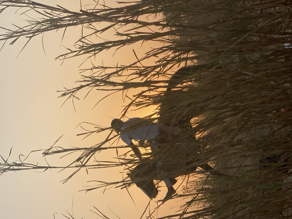 A man rides a dark horse in an outdoor setting. The image is obscured by a dense foreground of dry, brown vegetation. The man is wearing a light-colored top and darker pants. The background sky is a pale, warm gradient, likely indicating sunrise or sunset. The light filters through the vegetation, creating a hazy effect. The horse and rider appear to be silhouetted against the bright sky.