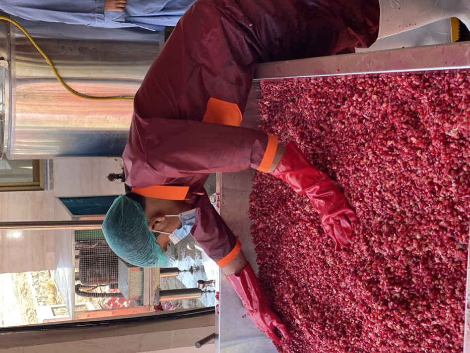 A person wearing a red protective suit, orange accents, and red gloves reaches into a large, stainless steel container filled with small, red pieces of food. They also wear a light green hairnet and a face mask. A stainless steel machine with a yellow hose is to the left. The setting appears to be a food processing environment.