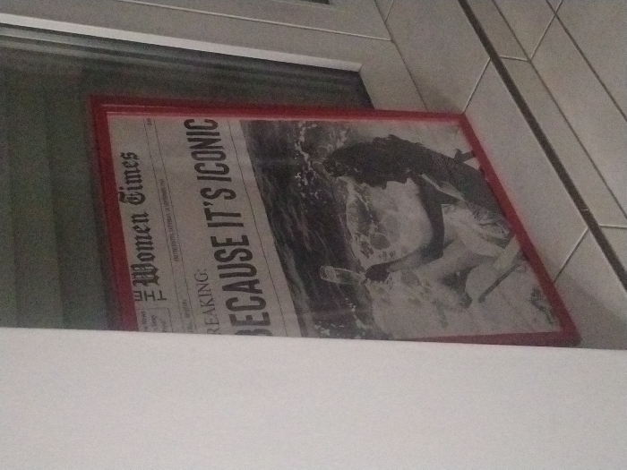 The framed print appears to be a newspaper front page, titled "The Women Times." The headline reads "BREAKING: BECAUSE IT'S ICONIC" in large, bold letters. An image accompanies the text, showing a woman, possibly in water or surf, with what looks like a bottle in her hand. The frame is red and the print is positioned near a window and tiled wall. The image is monochrome, likely black and white.