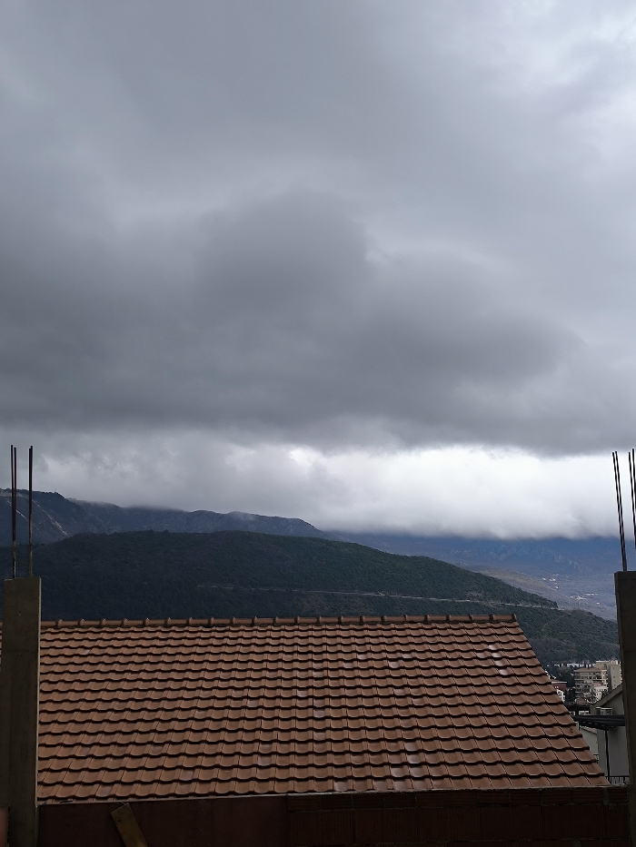 The image depicts a mountainous landscape in Budva, Montenegro, under a heavily overcast sky. In the foreground, a red-brown tiled roof occupies the lower portion of the frame. On the left and right sides, concrete pillars are visible, each featuring exposed metal rebar rods extending upwards. Beyond the roof, a range of dark green forested mountains stretches across the midground. A winding road is discernible on the mountain slopes. A horizontal band of white fog or low-hanging clouds obscures the mid-section of the mountains, situated beneath a vast expanse of dark gray clouds that dominate the upper sky. To the far right, below the mountain line, a cluster of light-colored buildings is visible, indicating an urban or suburban area. No people or active subjects are present in the scene.