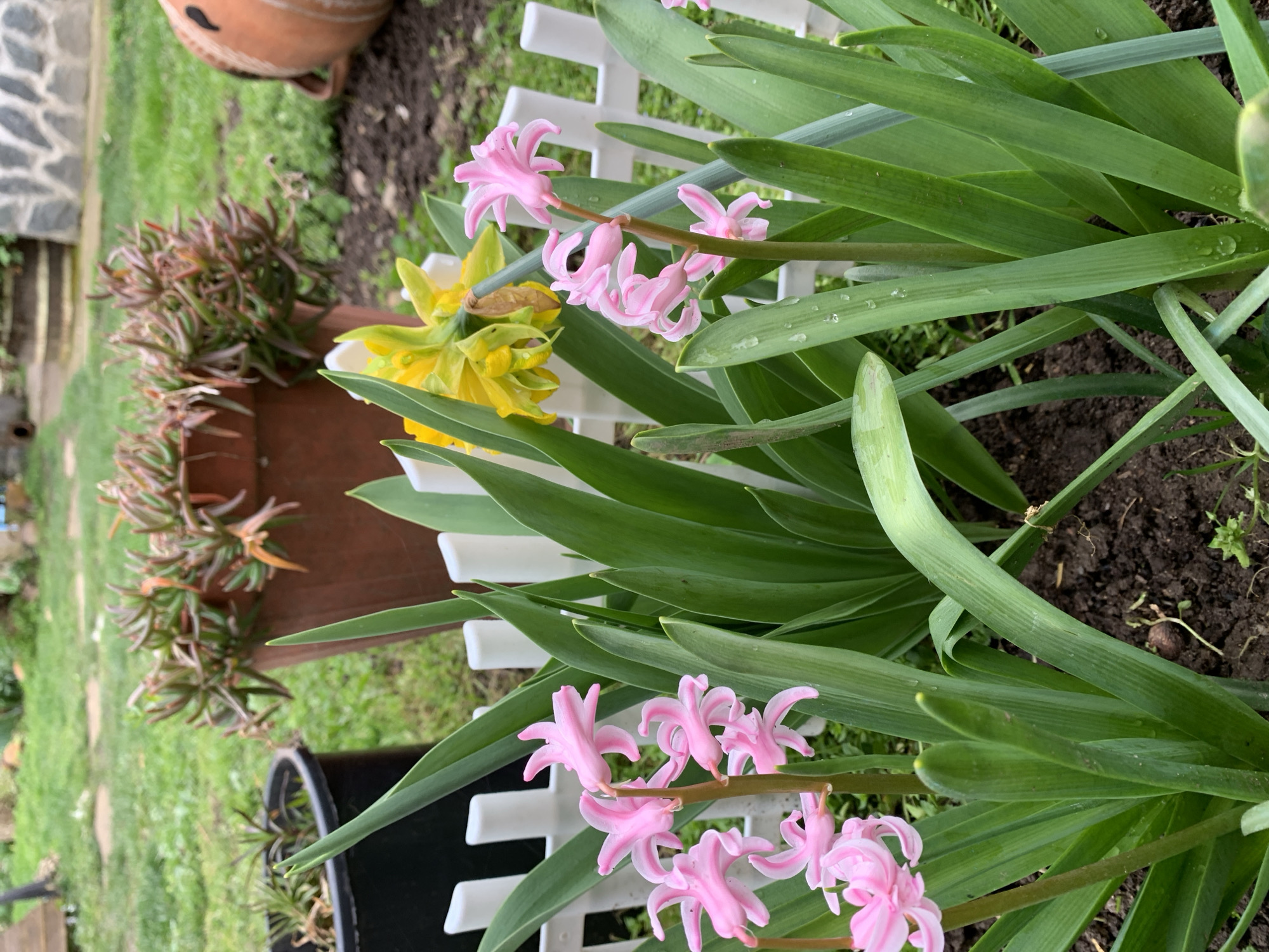 garden scene, likely in Lehchevo, Bulgaria. Two pink hyacinths and a yellow daffodil are prominently displayed against a white picket fence. Green foliage surrounds the flowers. A terracotta pot with a succulent plant sits behind the fence on the left, and a black pot is visible in the lower left. The ground is covered in grass and soil.