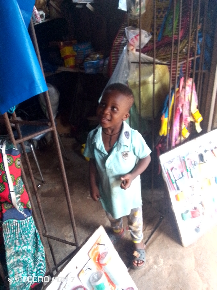 young dark-skinned child standing in what appears to be a retail or market stall in Unknown, Unknown