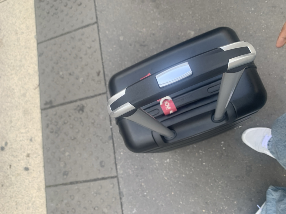 - "The image depicts a black hardshell suitcase with its silver and black telescoping handle extended, resting on a paved surface in Strasbourg, France" by FM-EKR3r2, licensed under CC BY 4.0
