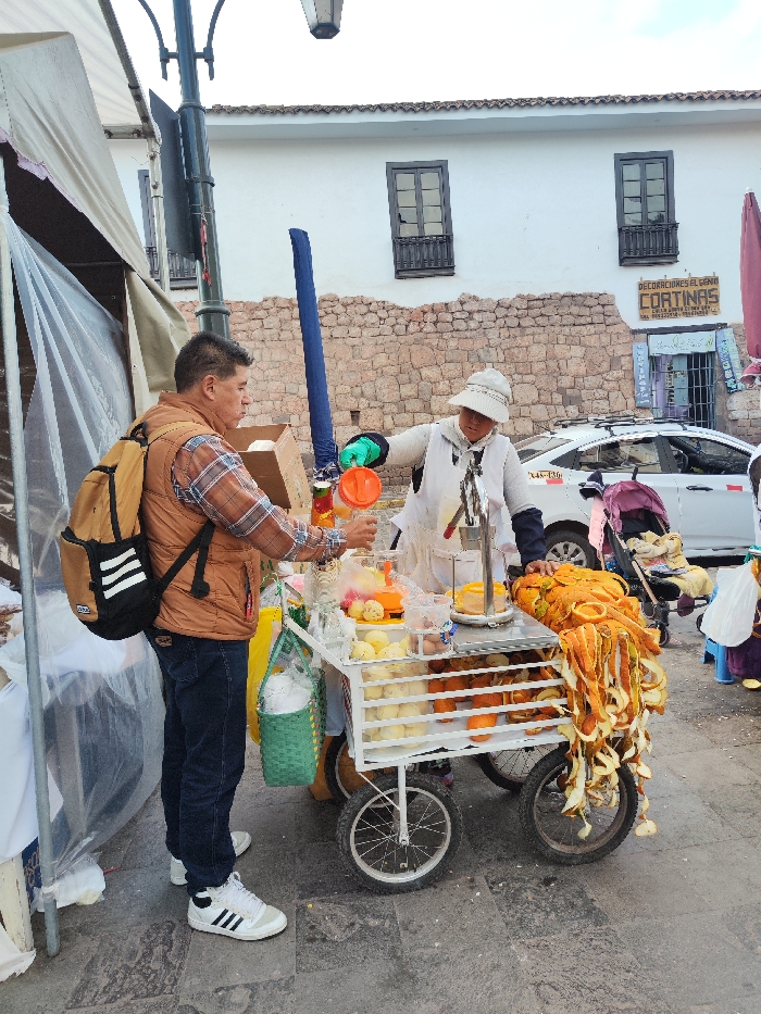 The image captures an outdoor street scene in Wanchaq, Peru, featuring a fruit juice vendor interacting with a customer