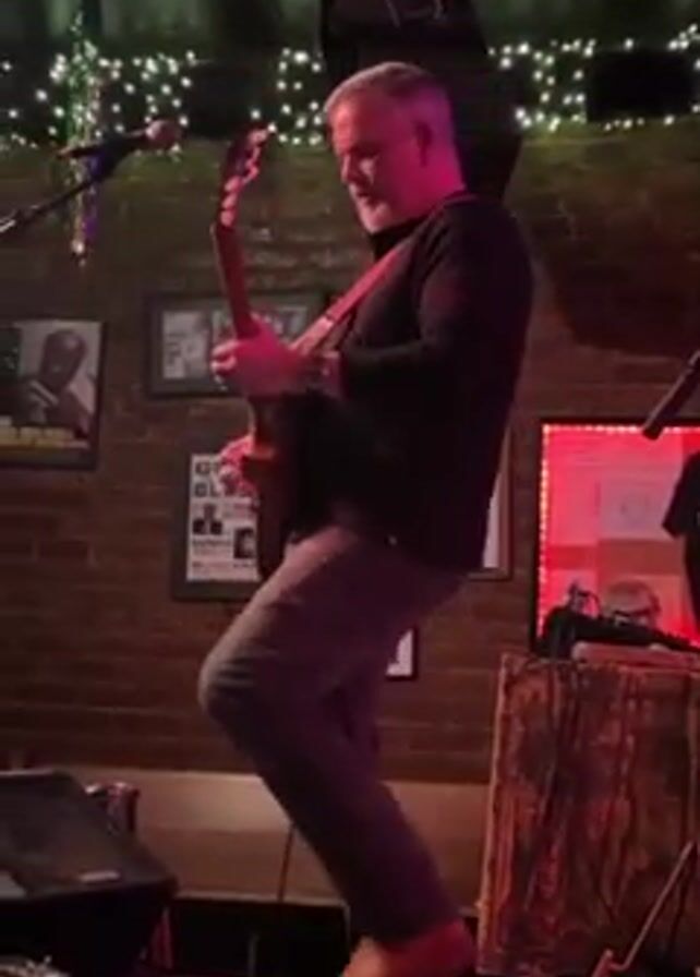 man playing an electric guitar on a small stage in what appears to be a bar or small music venue. The man has short gray hair, a dark-colored long-sleeve shirt, gray jeans, and tan shoes. He stands angled to the right of the frame, facing forward and slightly toward the left. He's actively strumming and playing the guitar, with his head tilted slightly up, suggesting he is singing. Behind him is a brick wall decorated with framed posters and photos, and a string of decorative lights. To his right, there's a wooden percussion instrument and a glimpse of a dark t-shirt hanging behind it. To his left and on the stage, a black speaker and a series of guitar effect pedals are visible. The lighting in the venue is somewhat dim and warm, creating a casual, intimate atmosphere. The camera angle is mostly static, capturing the musician's performance from a side view.