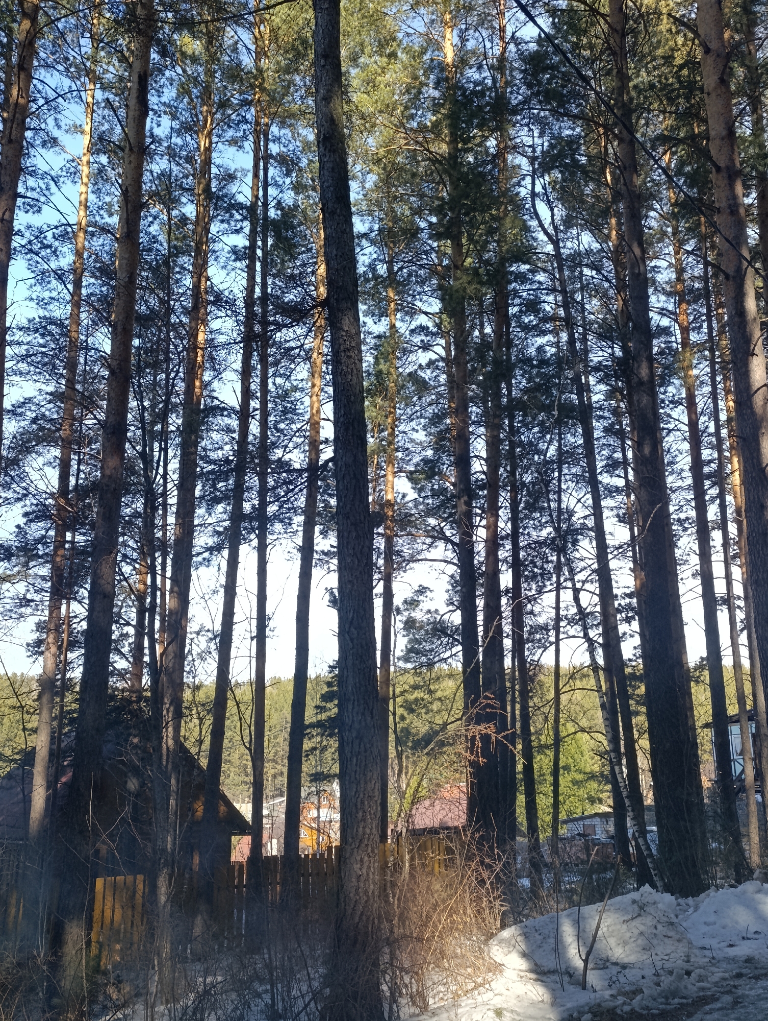 forest landscape in Krasnoyarsk, Russia, with tall, thin pine trees reaching towards a bright blue sky. In the foreground, there are patches of snow on the ground, indicating it is likely late winter or early spring. The middle ground reveals a glimpse of residential architecture behind a wooden fence, suggesting the forest borders a residential area. The absence of people suggests the scene is tranquil and undisturbed. The lighting suggests it is daytime, with the sun shining through the trees.