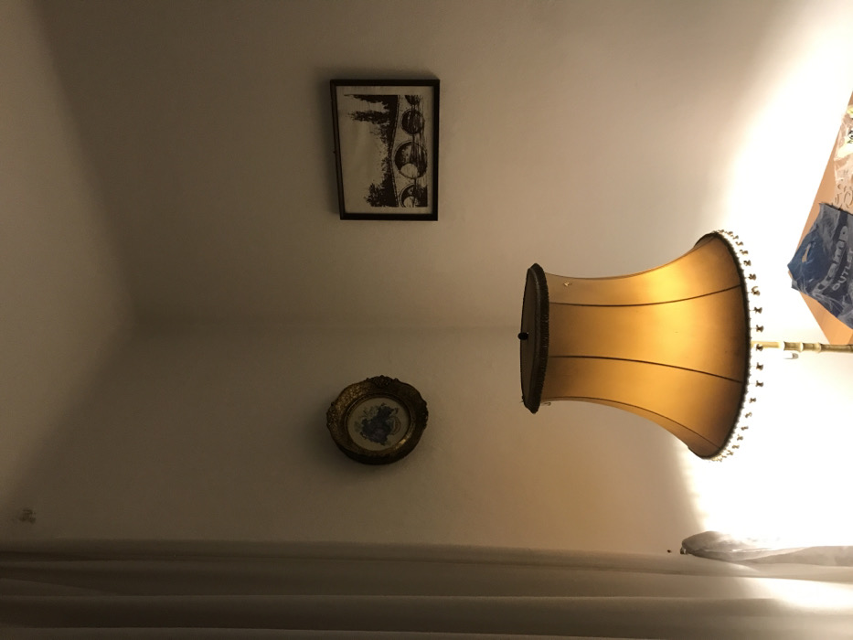 An interior corner of a dimly lit room is depicted. On the right, a tall floor lamp with a gold-toned stem and an illuminated, bell-shaped amber fabric lampshade with decorative fringe and tassels stands on a surface. A light-colored curtain hangs along the left wall. Above the lamp, on the left wall, a small, circular, ornate gold-framed picture containing an indistinct floral image is mounted. On the adjacent wall to the right, a rectangular framed monochromatic print or drawing depicts a multi-arched stone bridge over a body of water with trees on the banks, specifically resembling the Latin Bridge (Latinska Ćuprija) in Sarajevo, Bosnia and Herzegovina. A partially visible light-colored surface, possibly a table, is beneath the lamp, bearing a crumpled blue plastic bag with white lettering, including the word "OUTLET." No individuals or explicit actions are present.