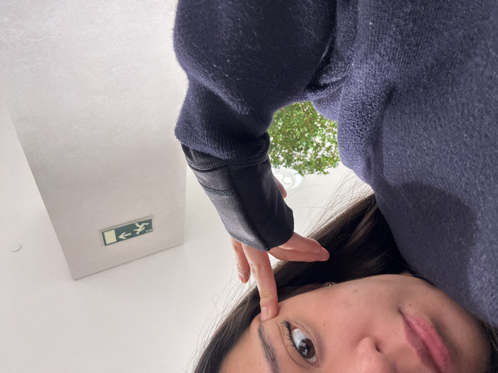 A selfie looking upward features a person with long, dark hair and fair skin wearing a dark blue sweater. Their finger touches their eyebrow. The background reveals a low-angle view of a white wall with a green and white emergency exit sign. Above the wall, green foliage is visible, possibly from trees. The unusual perspective suggests the photo was taken from below, pointing upwards.
