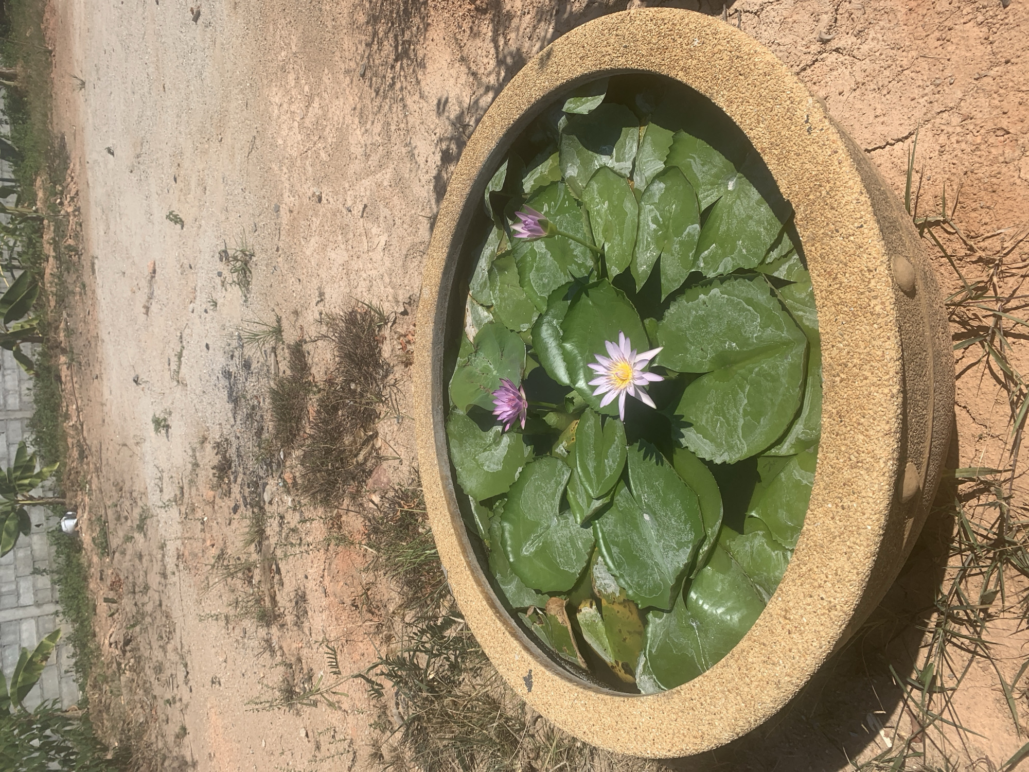 A round, textured light brown stone or concrete pot containing water lilies is situated on dry, reddish-brown earth in Baan Chaweng, Thailand