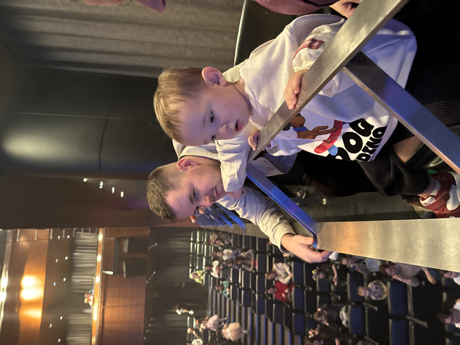 The image depicts an indoor scene within an auditorium or theater in Unknown, Russia. In the foreground, a young child, approximately 1-2 years old, with light brown hair, wears a white long-sleeved shirt featuring a cartoon rocking horse with "DOG DING" text, black pants, and red and white sneakers. The child is holding onto a silver metal barrier with both hands and is looking intently downwards and to the left with a slightly open mouth. To the left and slightly behind the child is an adult male, likely in his 30s, with short brown hair, wearing a light-colored collared shirt over a darker garment. He is leaning over the same barrier, extending his right arm forward, and also looking downwards towards the audience. A portion of another adult's face is visible on the far right, next to the child. The metal barrier features a diagonal section with a blue light reflection. In the background, multiple rows of dark-colored auditorium seats are visible, occupied by numerous individuals, including adults and children. Some children in the audience appear to be dressed in light-colored costumes, one resembling a ballet dress. The overall lighting is dim, with some areas illuminated by warm, amber light, particularly a wooden-paneled section in the upper left background. Dark vertical pillars and curtains complete the background setting.