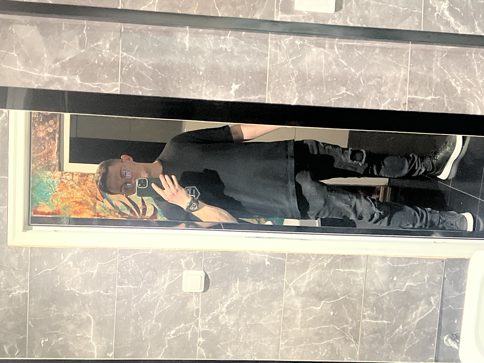 A male individual is captured in a full-length mirror selfie within a tiled room. The subject, viewed from the chest in the reflection, wears spectacles, a black short-sleeved t-shirt, dark ripped jeans, and dark sneakers with white soles. A dark wrist accessory with metallic elements is visible on his left wrist. He holds a dark-colored smartphone in his right hand, angled to photograph his reflection. The room features walls covered in large, rectangular grey tiles with white marble-like veining. A white electrical light switch is affixed to the tiled wall on the left. A portion of a white ceramic fixture, consistent with a basin or toilet, is present at the bottom left, adjacent to a metallic wall-mounted fixture. The floor is dark and appears to be tiled. The reflection within the mirror shows a background wall with abstract, multi-colored artwork in shades of orange, turquoise, and black, alongside a dark doorway. The image lacks visual information to specify a location within Sliven, Bulgaria.
