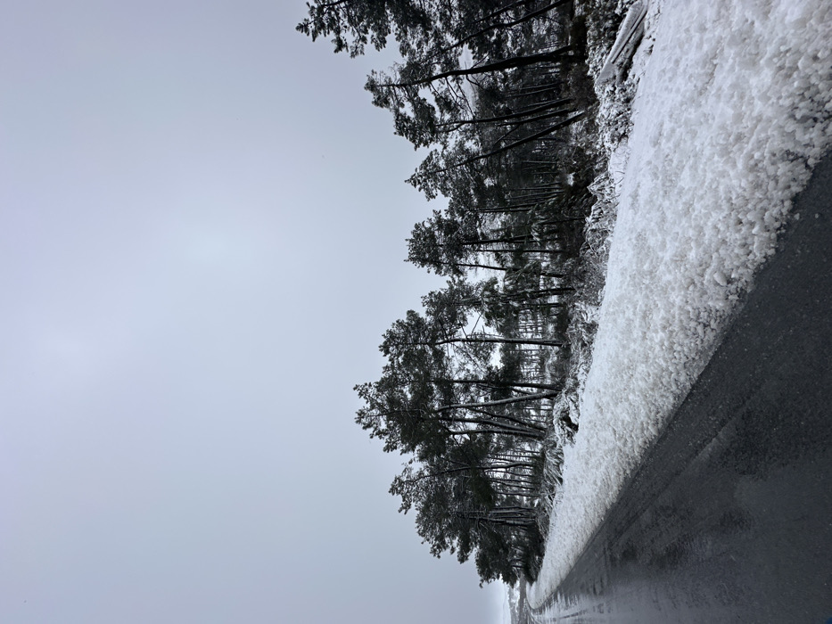 The scene depicts a winter landscape in Mondim de Basto, Portugal, under an overcast grey sky. A dark, wet asphalt road occupies the lower left quadrant, curving gently leftwards into the distance. Along the right side of the road, a substantial bank of granular white snow extends into a dense forest of tall, dark coniferous trees, likely pines. Snow adheres to the branches of these trees and the underlying vegetation. A fallen log is partially obscured by snow on the far right within the wooded area. No human or animal subjects are visible. The environment exhibits diffused, consistent lighting typical of a cloudy winter day.
