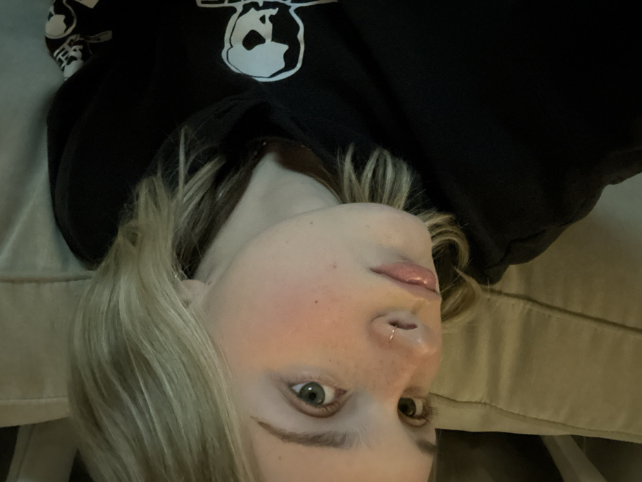 A pale-skinned person with light blonde hair and green eyes is looking at the camera. They have freckles and a lip ring. They are wearing a black hooded sweatshirt with a white graphic on the shoulder. The background is a neutral-colored, possibly beige, cushioned surface. The image is rotated 180 degrees, presenting an upside-down perspective. The lighting is soft and diffused.