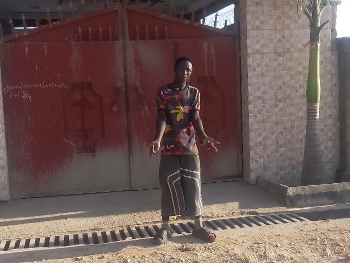 A slim man stands on a dusty street in front of a large, rusty red gate. He wears a multi-colored patterned shirt and wide-legged, gray and white pants. His hands are outstretched in a gesture. Behind him, to the right, is a tiled wall and a palm tree. The ground is sandy and a drainage grate runs across the bottom of the frame. The image is brightly lit, suggesting it was taken during daylight.
