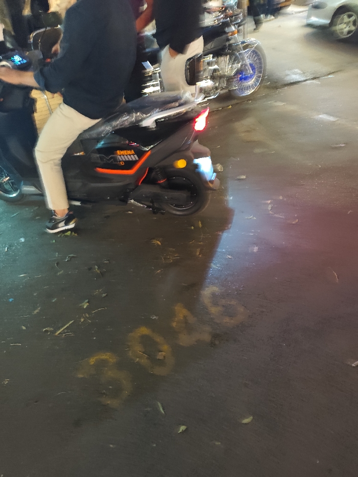 The image depicts an urban street scene at night in Al-Muhajerin Municipality, Syria, illuminated by artificial light sources. In the midground, a person wearing a dark long-sleeved shirt, light-colored pants, and black sneakers with white soles is seated on a black electric scooter. The scooter's seat is partially covered with clear protective plastic, and its side bears orange and white branding that appears to read "EMENA." The scooter's red taillight and a white light illuminating the rear license plate area are active. Behind the electric scooter, another individual is partially visible, along with a conventional motorcycle featuring a blue spoked front wheel. Further in the background to the right, a silver car is partially visible and out of focus. The ground surface is dark, appearing wet or reflective, with numerous small pieces of debris scattered across it. Yellow painted numbers, "3049," are visible on the ground in the foreground, partially obscured. Reflections of the scooter's lights and other ambient light sources are visible on the wet surface.