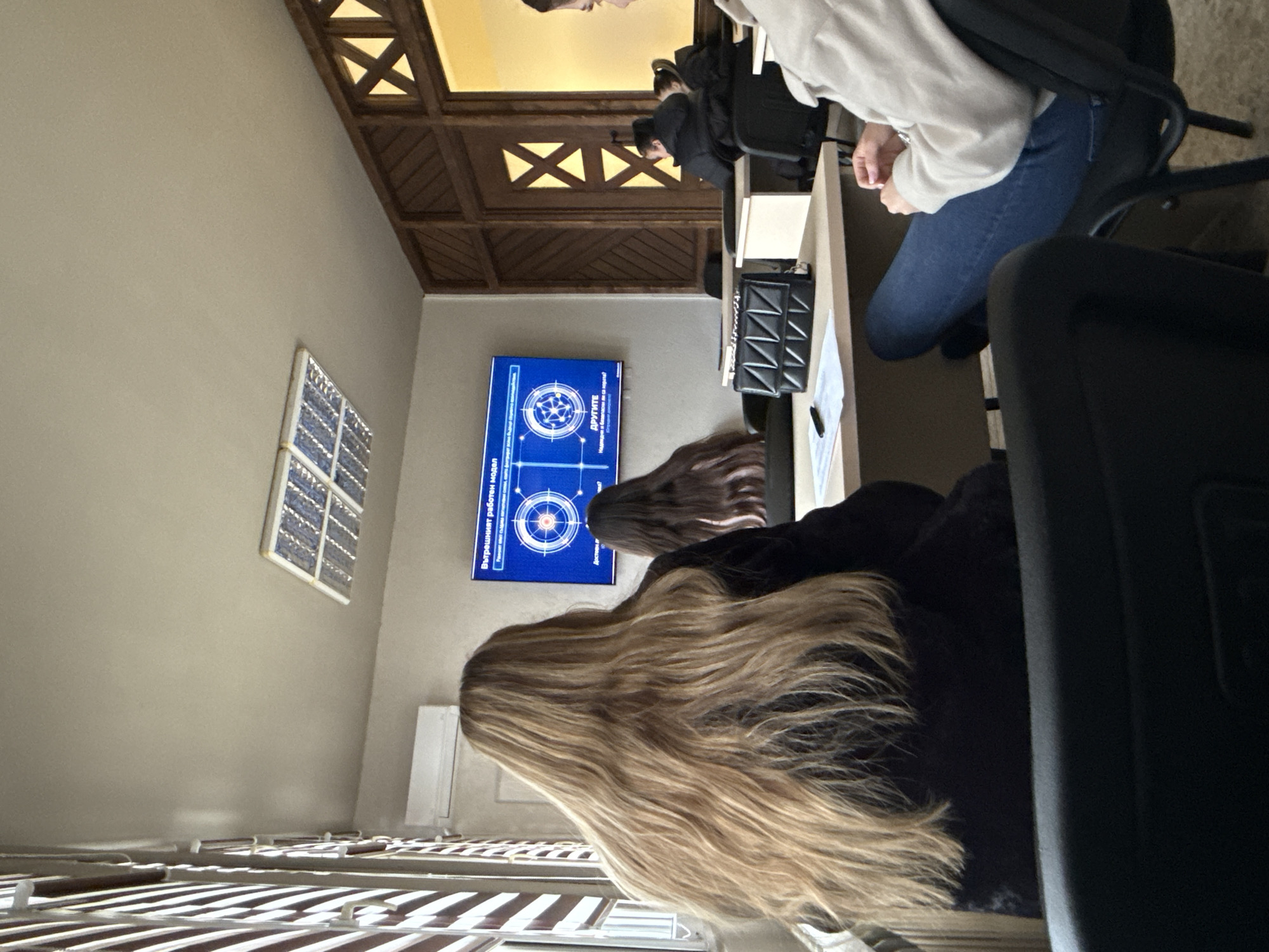 classroom in Plovdiv, Bulgaria, possibly at a university or training center. Several people are seated at desks, facing a screen displaying a blue image with circular patterns and text in Cyrillic. A woman with long blonde hair is seated in the foreground. Behind her, another person with dark hair is visible. To the right, a person wearing jeans and a light-colored top is seated in a chair. Other people are further in the background. The ceiling is decorated with a dark wood lattice pattern. A window with bars is visible in the lower left corner of the frame.