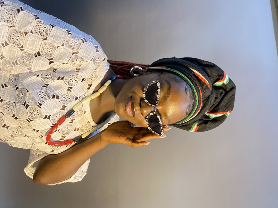 A single adult female is presented in a medium shot within an indoor setting in Unknown, Nigeria. The individual, with dark skin and visible reddish-brown dreadlocks, wears a black headwrap featuring horizontal green, white, and red stripes. Her eyes are obscured by cat-eye sunglasses with dark lenses and rhinestone-encrusted frames. A silver-colored hoop earring is visible on her left ear. She is dressed in a white, short-sleeved top exhibiting an intricate geometric lace pattern. A long necklace, composed of cylindrical beads in off-white, dark grey, and red, is worn around her neck. Her right hand is positioned near the right temple, lightly touching the sunglass frame. The background is a plain dark grey wall or backdrop, illuminated by soft, frontal lighting.