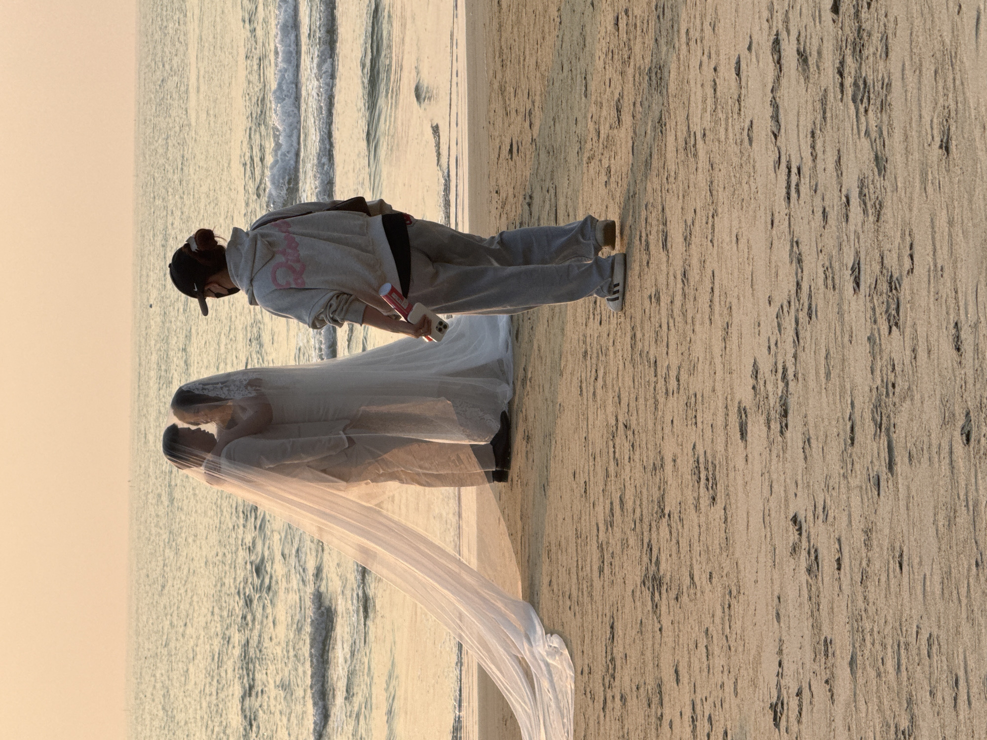 A newlywed couple kisses on a beach in Đà Nẵng, Vietnam. The bride wears a white gown and veil, while the groom is dressed in casual clothing. A person in a grey sweatsuit holds a phone and a can. The beach and ocean are visible, with waves rolling in. The time of day is late afternoon or early evening.