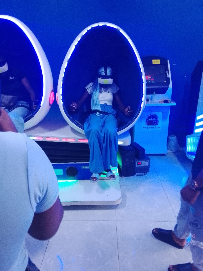 The image depicts an interior scene at a virtual reality (VR) arcade in Gandu Albasa, Nigeria, characterized by pervasive blue ambient lighting. Two individuals are seated within distinct, egg-shaped VR simulation pods, each featuring a white exterior with blue LED trim. The subject in the right pod, identified as female, is observed wearing a light-colored top, blue wide-leg trousers, and white sandals. She has a light blue fabric draped over her left shoulder and is equipped with a white VR headset featuring a yellow-green stripe across the front, gripping a controller in each hand. The interior of her pod is illuminated with blue light. The subject in the left pod is partially visible, wearing a dark t-shirt with "alo" printed on the front, and light-colored jeans. This individual is also equipped with a VR headset, and the interior of their pod shows a mix of blue and red lighting. In the immediate foreground, the back and right shoulder of a person wearing a light blue t-shirt are visible on the left. On the right, the lower legs of another individual, wearing light-colored jeans and black slide sandals, are partially visible. In the background, an arcade gaming machine with a screen and controls is present. Adjacent to it stands a blue pedestal labeled "Imaginary Lane" featuring a VR headset logo. A black electronic device, identified as a power stabilizer unit with a red digital display, is positioned on the floor near the right VR pod. The floor is composed of light-colored tiles, and the walls are uniformly blue.