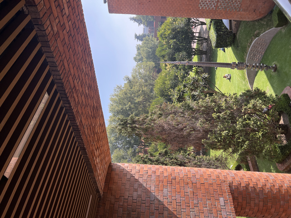 The image displays an outdoor scene from an elevated perspective, likely a balcony or walkway, at the Ciudad Universitaria (UNAM) in Mexico City, Mexico. The top of the frame features a ceiling constructed of dark brown horizontal wooden slats, with a rectangular fluorescent light fixture recessed within. Below this, a substantial red brick overhang or beam extends horizontally, with bricks laid in a stretcher bond pattern. To the left, a curved column or wall segment, also constructed of red bricks, rises, with its left side illuminated by direct sunlight, casting a sharp shadow line. The view opens to a vibrant green courtyard under a clear, light blue sky. Numerous trees and shrubs are scattered across the landscape; a prominent tall, slender coniferous tree, partially brown at its apex, stands centrally in the foreground, encircled by a low, circular brick planter. Further back, denser groupings of green-leafed trees and smaller shrubs, including some with palm-like fronds, are visible. On the manicured grass lawn, a distinctive tall, vertical abstract sculpture is positioned in the mid-ground, slightly to the right of center. The sculpture consists of stacked, irregular metallic or stone segments that gradually taper upwards to a pointed top, resting on a curved concrete or stone base. Two individuals are present on the grass: one person is seated on the lawn to the left of the sculpture, facing away from the viewer, wearing light-colored clothing. A second person is partially visible further back on the grass, behind and to the right of the sculpture, also in a seated position. The entire scene is brightly illuminated by direct sunlight, casting defined shadows.