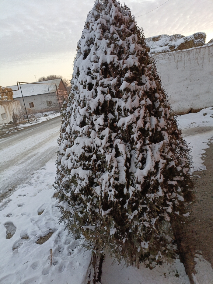 The image depicts a snow-covered outdoor scene in Qoraqosh, Uzbekistan, characterized by winter conditions under an overcast sky with subtle warm light. The central subject is a densely foliated, conical evergreen tree, heavily laden with white snow that adheres to its branches and needles. To the immediate left of the tree, the ground is covered in undisturbed snow featuring multiple distinct footprints. An unpaved or minimally-paved road, partially covered in snow and slush, curves from the lower-left foreground towards the mid-left background. In the mid-ground on the left, several buildings are visible; one prominent structure has a light-colored facade, a dark, snow-dusted pitched roof, and a visible rectangular window. Adjacent to this structure is a substantial, snow-dusted mound of what appears to be hay or straw, and dark metal framework is also present. To the right of the central tree, a light-colored wall, possibly constructed from stucco or earth, is visible, extensively covered in snow and ice. Behind and above this wall, a substantial drift or accumulation of snow forms a natural embankment. The sky above is cloudy, exhibiting faint yellow and orange hues near the horizon, indicative of low sun angle. No individuals are present in the scene.