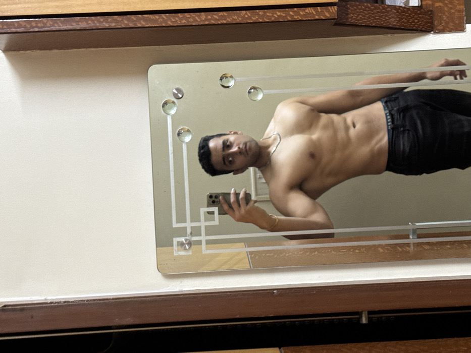 - "A shirtless man is reflected in a rectangular mirror with decorative silver circles and lines" by FM-KoaHv1, licensed under CC BY 4.0
