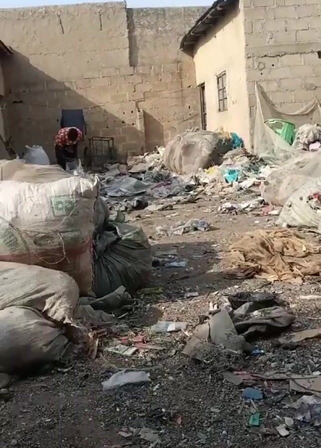 dirty, trash-filled area enclosed by buildings. There are large, full bags scattered throughout the space, along with loose debris like plastic, paper, and miscellaneous garbage. A person wearing a red and black patterned shirt is visible in the background, apparently working amidst the waste. The building to the left is made of corrugated metal, while the other buildings are of cinder block construction. The sky is overcast, and the overall impression is one of poverty and poor sanitation.