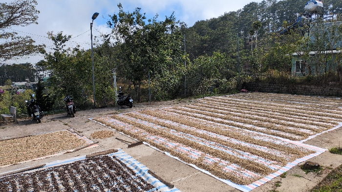 The image depicts an outdoor agricultural drying area on a concrete surface, consistent with the described location of Phát Chi, Vietnam