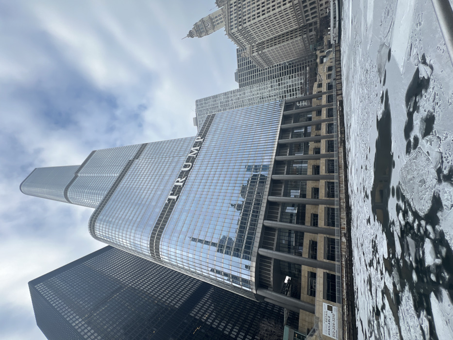 Trump International Hotel and Tower rises into a cloudy sky, its reflective glass facade displaying the "TRUMP" name vertically. Adjacent to the Trump building, a dark, solid structure stands. A nearby building featuring an older architectural design is visible in the upper frame. Along the right edge of the image, a surface covered in ice is seen. The overall perspective of the shot is looking up from the ground.