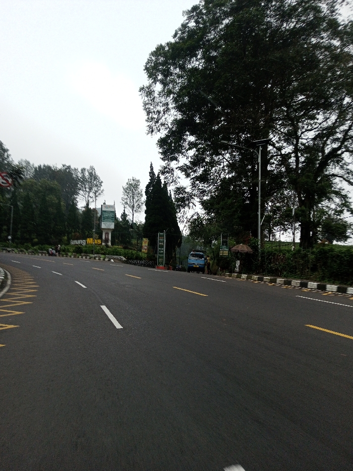 A view of a paved road curves gently to the left with painted lane markings. A large sign with “Amung Mas” is visible on the side of the road, amidst trees and greenery. A blue van is parked nearby. A utility pole stands beside a large tree. The sky is overcast and muted. The road has marked edges with alternating light and dark sections.