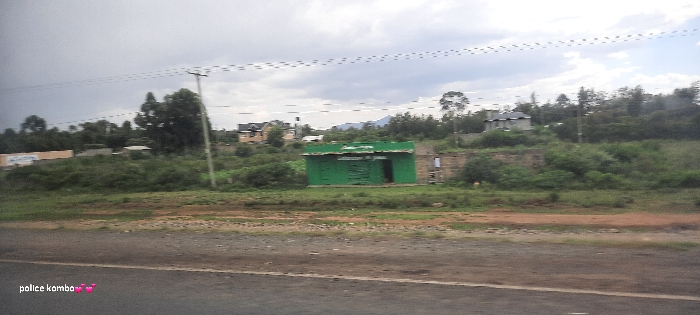 A green, dilapidated structure stands beside a road. Buildings and a utility pole are visible in the distance. Lush vegetation covers the surrounding terrain. A cloudy sky forms the backdrop. Text reading "police komba" with heart emojis appears at the bottom left of the image. The perspective suggests the photo was taken from a moving vehicle.