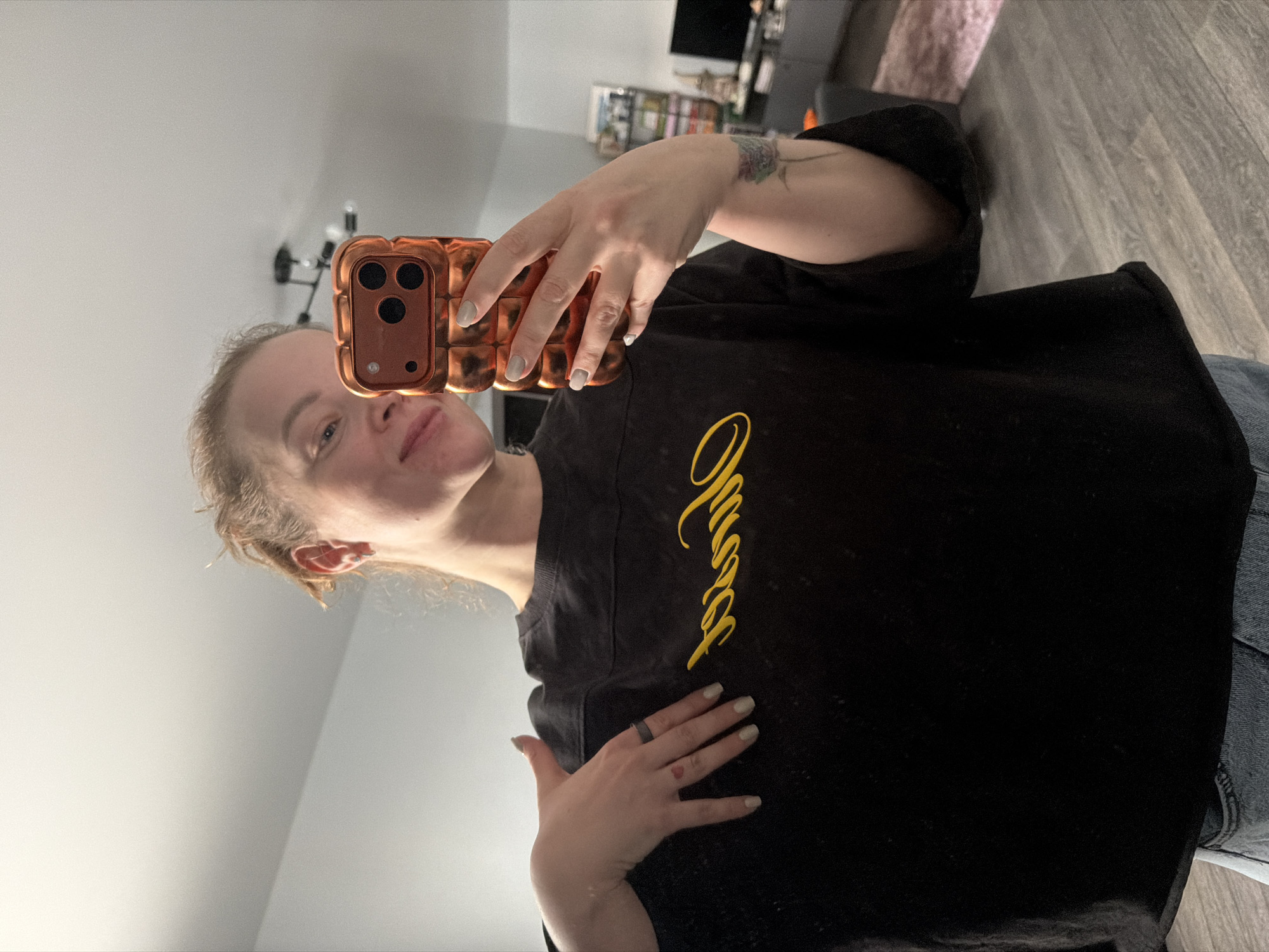 A female subject is captured in a mirror selfie within a residential interior. She has light-toned skin, light brown hair pulled back, and a subtle smile. She wears a black long-sleeved top featuring yellow cursive script "Odessa" on the chest, with blue denim visible at the bottom. Her left hand, adorned with a small red heart tattoo between the index and middle finger knuckles and a dark ring on the ring finger, rests on her chest. Her nails are painted light beige. She holds a smartphone with a metallic copper-colored, textured case in her right hand, exposing a colorful floral tattoo on her outer right forearm. The background reveals an apartment living space with light gray walls, white ceiling, and light-toned wood-look flooring. A black multi-bulb ceiling light fixture is mounted centrally. Blurred items in the background include a metal wire shelving unit, a television set on a low cabinet, a dark sofa, and a light pink shag rug. The image provides no discernable visual cues to identify the location as Moscow, Russia.