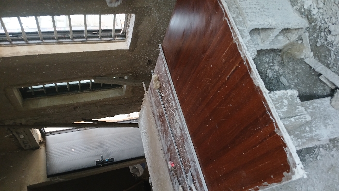 The image displays an indoor construction or renovation scene located in Angwan Sayawa, Nigeria. The environment consists of unfinished, rough concrete walls, heavily textured and speckled with white dust or plaster residue. The floor is also unfinished concrete, covered in similar white debris and fragments. In the foreground and midground, a large, rectangular surface made of dark reddish-brown wood, exhibiting a visible grain and a semi-glossy finish, is centrally positioned. This wooden surface is significantly covered in white particulate matter. Resting upon it are two parallel, silver-colored metal tracks or guides, also coated in white dust. Near the left end of these tracks, a small object emitting a faint pink light is visible. Towards the right end of the tracks, a small cluster of light-colored, possibly fibrous material is present. The wooden surface is supported by a rough, unfinished concrete block structure, which reveals an irregular cavity beneath its right side. In the background on the left, a light-colored, horizontally ridged metal door, likely a security door, is seen partially open, revealing a darker, indistinct area beyond. A white bucket or container rests on the floor near the door. To the right, two narrow, vertical windows with dark metal security bars allow natural light into the space. The window frames are basic and unfinished, consistent with the surrounding walls. No individuals are present in the scene; the arrangement of materials and the unfinished state of the room indicate ongoing construction or renovation activities.
